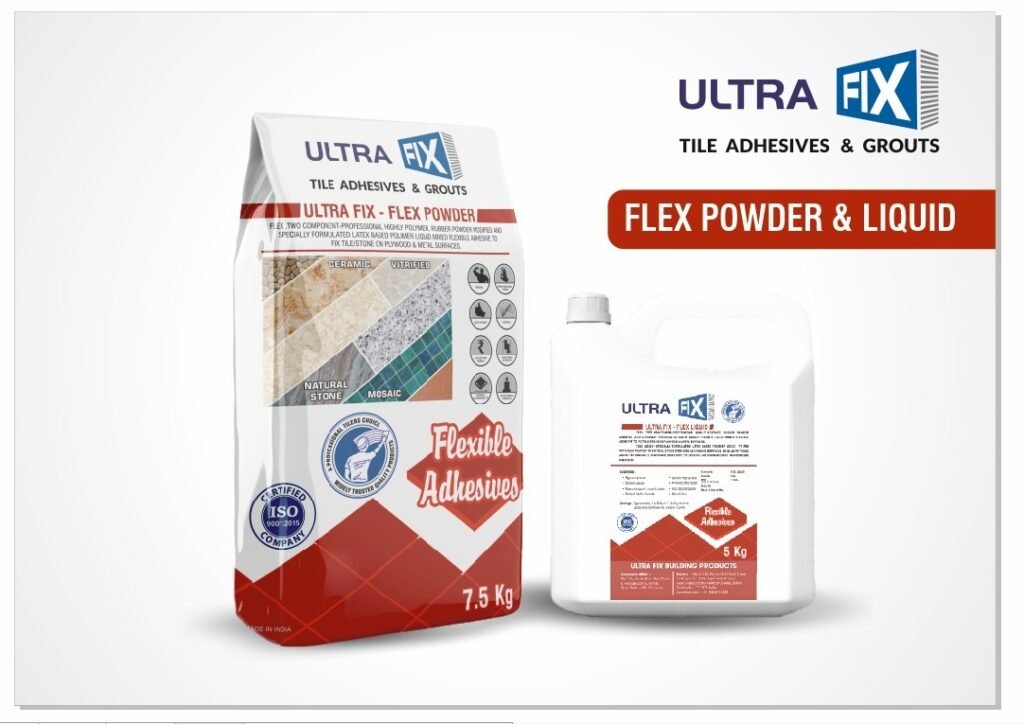 Two-part, adhesive comprising of rubber-based powder and water-based polymer liquid. Flexible adhesive for use in areas where tiling is likely to be subjected to some limited background movement or vibration, especially wood, plywood & metal surface.